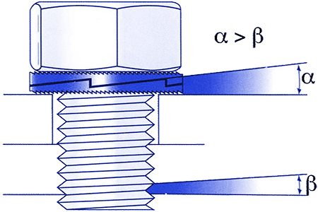 ◆TOP-LOCK®防松墊圈是由兩片完全相同的墊片組成,每片的外側帶有放射狀的凸紋面,內側為斜齒面。TOP-LOCK®獨特的墊圈凸輪齒牙傾斜角度α大于螺栓螺紋傾斜角度β。